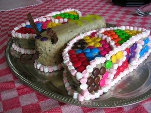 July 2008 – my birthday (cake baked and decorated by S.): Purply cream cheese icing, halved Maltesers on the ‘skirt’, mint sticks and a musk stick for ‘arms’ and laser-nose as well as around mid-height, jellybeans on head, licorice detail on base and mid-height, chocolate discs/Wagon Wheels under head.