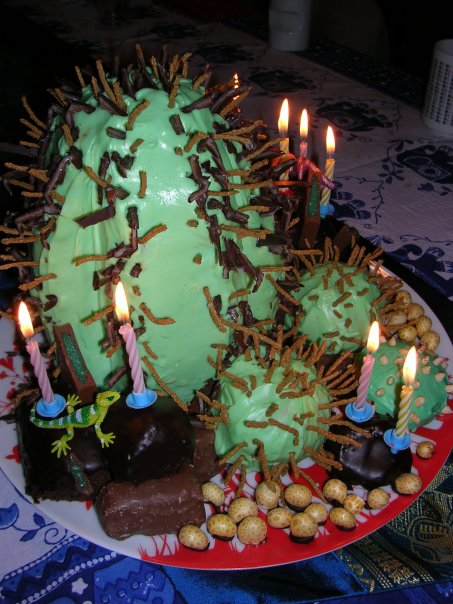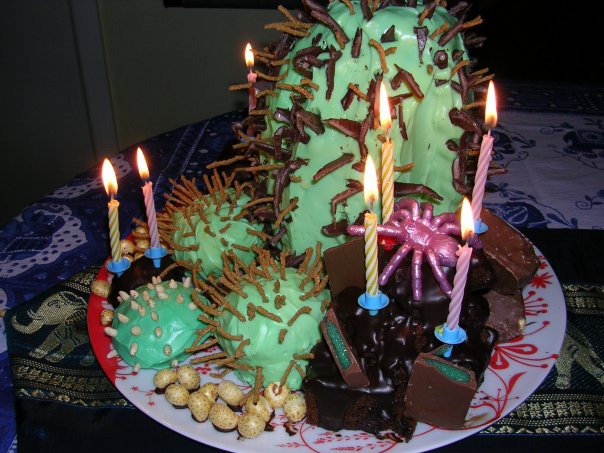June 2008 – S.’s birthday cake (cake baked by Mum; decorated by K.): Green cream cheese icing, honeycomb and ganached cake ‘boulders’, cactus spination = All Bran and shards of Peppermint Crisp, corn puff gravel, random rubber animals (spider and lizard).