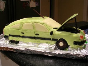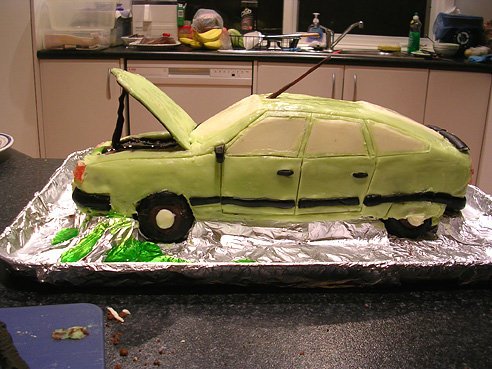June 2008 – D.’s birthday cake (cake baked by S.; decorated/styled by S. and K.): Citreon CX Series 2 – Coloured white chocolate icing with shaped white chocolate ‘windows’, licorice bumpers and rear vision mirrors (wheels were licorice + dark chocolate), jube lights (T.’s only contribution to the enterprise – oh, hang on, I might’ve done the piping on the number-plates, too), toffee and dark chocolate aerial + bonnet prop, white chocolate license plates with dark chocolate text, lime Aeroplane jelly hydraulic fluid.