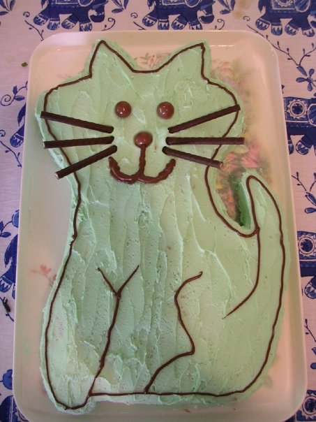 December 2007 – E.’s 1st birthday cake (bought cake [gasp!]; decorated by T. and S. [mostly S., let’s be honest]): Butter icing + Malteser eyes and nose + chocolate mint stick whiskers + piped chocolate details.