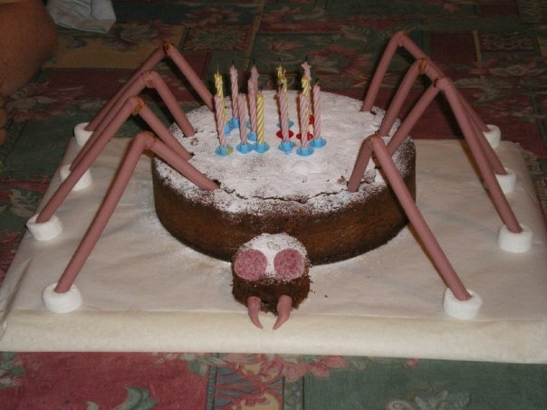 January 2008 – C.’s birthday cake (cake baked by Mum; decorated mostly by S.): Dusted icing sugar + “Boss” caramel stick legs and fangs (welded into shape over a gas-stove by S.) + marshmallow feet + sugar-dusted jelly-fruit eyes.